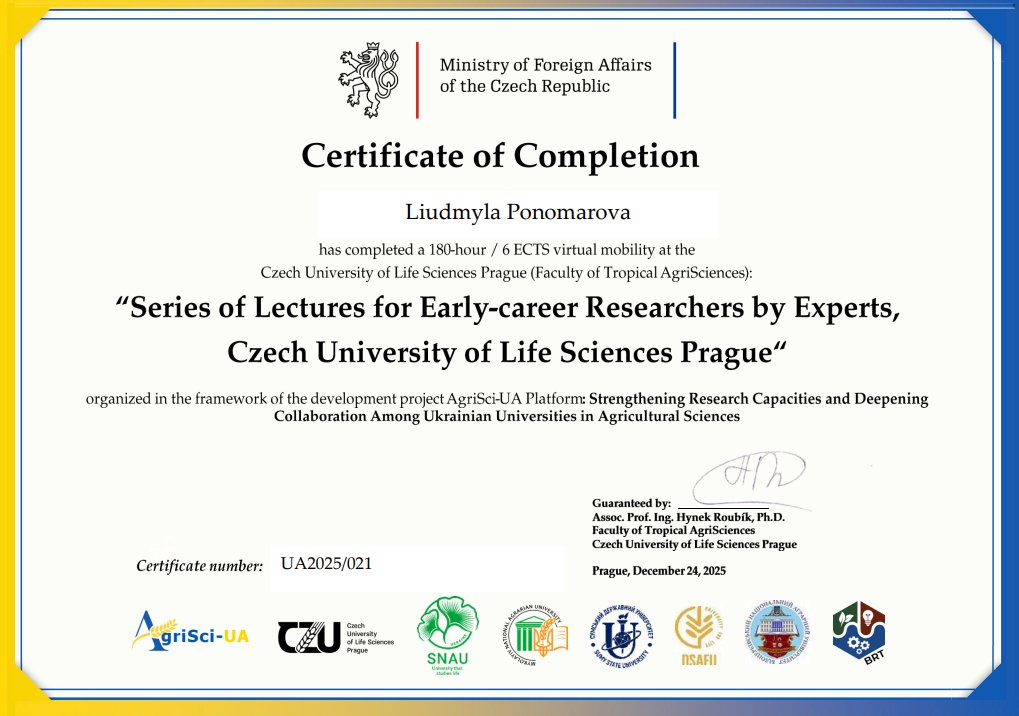 Викладачі та студенти кафедри теоретичної та прикладної хімії взяли участь у міжнародній програмі віртуальної академічної мобільності, організованій Czech University of Life Sciences Prague (CZU), у межах проєкту AgriSci-UA Platform: Strengthening Research Capacities and Deepening Collaboration Among Ukrainian Universities in Agricultural Sciences.