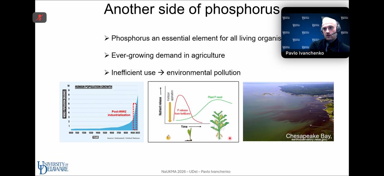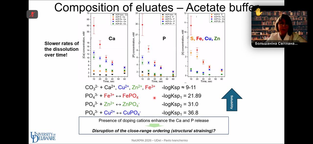 Тема доповіді – «Багатофункціональний фосфор: хімічні та фізико-хімічні властивості кальцій фосфатів як біоматеріалів і добрив». Спікером виступив випускник кафедри хімії НаУКМА, PhD, науковий співробітник лабораторії екологічної біогеохімії факультету наук про рослини та ґрунти Університету Делаверу (США) Павло Іванченко.